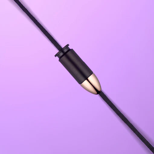 Pulsera de cordón negro para hombre y mujer de la colección Bang Bang, con cuerpo de titanio DLC negro cepillado y cabeza de bala en oro rosa pulido de 18 quilates.