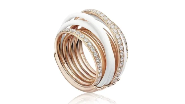 Anillo compuesto por múltiples aros realizados en oro rosa, cerámica blanca y diamantes.