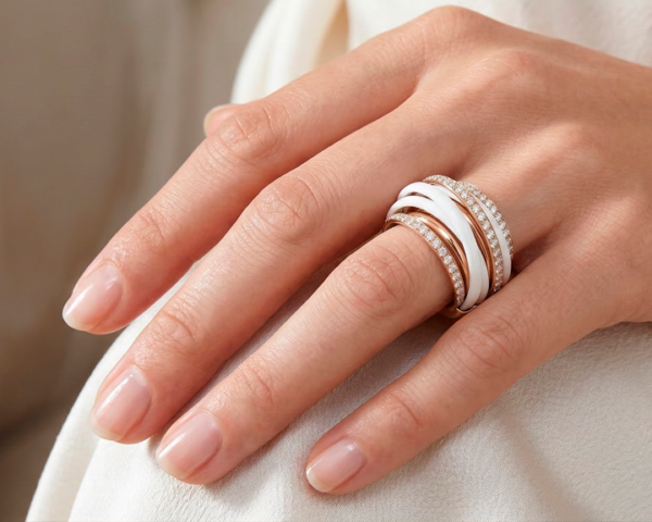 Anillo compuesto por múltiples aros realizados en oro rosa, cerámica blanca y diamantes.