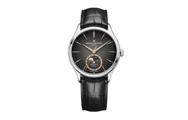 Como máxima expresión del reloj redondo, esta sofisticada pieza con correa de piel de aligátor negra intercambiable se ha concebido para el hombre activo de hoy en día. Posee un movimiento Manufactura Baumatic con 5 días de reserva de marcha. La complicación de fase lunar tradicional a las 6 horas realza la esfera lacada en gris degradado, con una indicación de fecha.