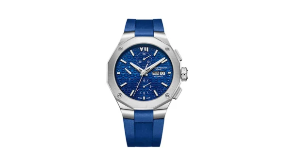 Equipado con un movimiento automático Valjoux, este Riviera se adorna con una esfera azul con acabado satinado soleil y una correa de caucho azul a juego. Un reloj con un marcado carácter que se inscribe a la perfección en la tradición de cronógrafos de la Maison.