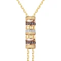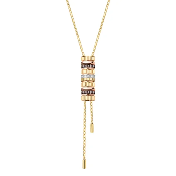 El collar de corbata Quatre Classique juega con los códigos de identidad de la colección lanzada en 2004. Grosgrain, Double Godron, Clou de Paris y Ligne de Diamants se unen para ofrecer una pieza donde la tradición y la modernidad interactúan, transformándose de un collar largo a una gargantilla con solo deslizar su motivo central. ¡Icónico!