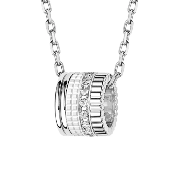 La Edición Quatre Double White se presenta en forma de colgante. Hyceram blanco mate, diamantes brillantes y oro blanco pulido: el contraste de materiales refuerza su diseño gráfico. El brillo monocromático de este collar reafirma tu estilo con total libertad.