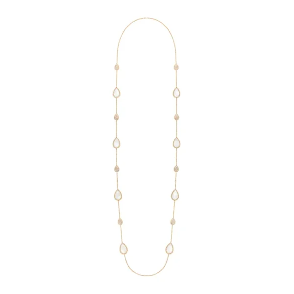 Este collar largo Serpent Bohème, ricamente decorado con dieciséis motivos de gotas, combina el brillo del nácar blanco con el destello de los diamantes. Sutil y de encantadoras proporciones, su estilo es libre y sensual.