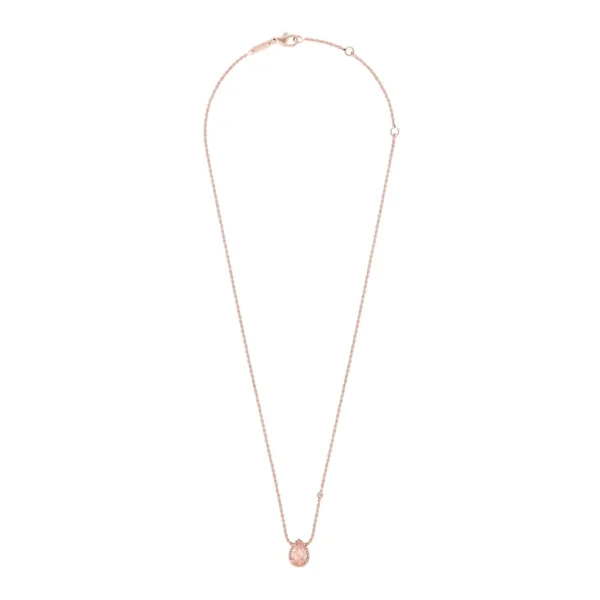 Este colgante Serpent Bohème está disponible en versión monocromática. Por un lado, el oro rosa adorna la cadena retorcida, de la que cuelga delicadamente un diamante redondo. Por el otro, el cuarzo rosa aporta un toque de suavidad al icónico motivo de gota.