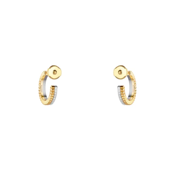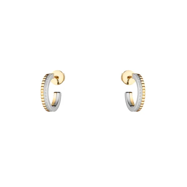 Con un diseño gráfico impactante y un tamaño delicado, los pendientes de aro pequeños Quatre Radiant Edition poseen todas las características de una creación atemporal. El motivo de grosgrain, un impactante homenaje a la estrecha relación de Boucheron con la alta costura, se realza con una hilera de diamantes. Mini Quatre para un impacto máximo.