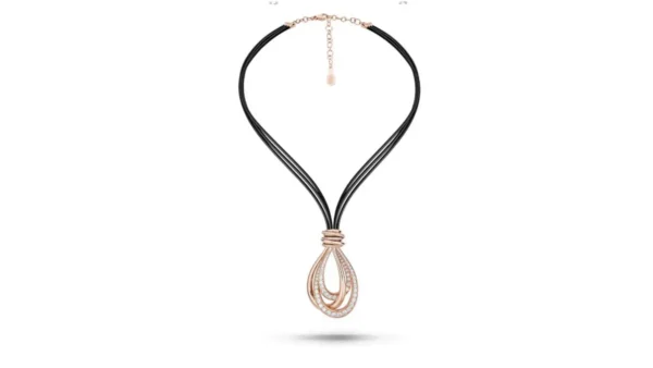 Colgantede oro rosa y diamantes, compuesto de una superposición de preciosos anillos entrelazados de oro rosa parcialmente engastados de diamantes de talla brillante  sujetado por cordón de caucho.