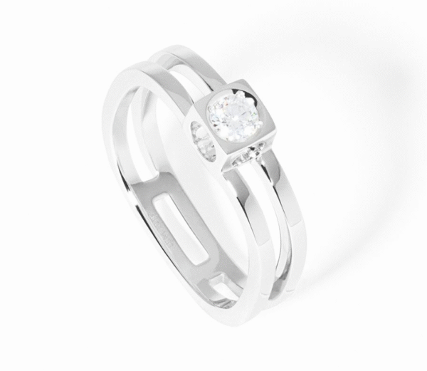 De exquisita sencillez, este anillo de 2 hileras está disponible en versión de oro blanco, realzado con un precioso diamante en su centro. Con su forma cuadrada, tan característica de dinh van, esta joya se adapta perfectamente al dedo para la máxima comodidad.