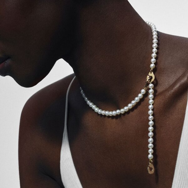 El emblemático motivo Menottes dinh van de oro amarillo se redescubre en una versión bicolor que combina el brillo de las perlas de agua dulce con el de la hematites.