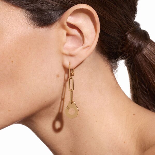 Suspendido en una cadena Maillon, la firma de la casa Dinh Van, el icónico motivo está disponible en la talla. Este par de pendientes de oro amarillo es la última incorporación a las creaciones de Menottes dinh van, una colección icónica desde hace más de 45 años.