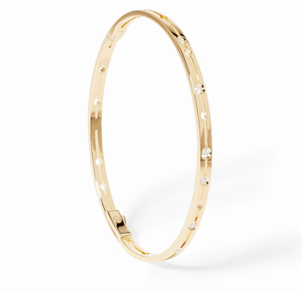 La pulsera Pulse se presenta en una versión más fina en oro amarillo engastado con diamantes y sigue marcando la pauta en la actualidad. Una pulsera atemporal que viste la muñeca y que puede acumularse con su versión grande, una pulsera Serrure o un brazalete en cadena Menottes dinh van
