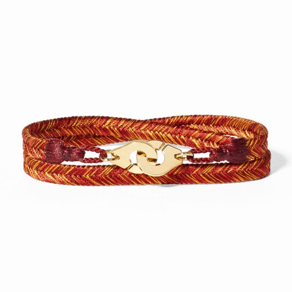 Disponible en edición limitada, la pulsera tejida Menottes dinh van R10 se declina en un tejido rojo colorado. Esta joya se lleva en doble vuelta, resaltando el icónico motivo Menottes dinh van R10 en oro amarillo.