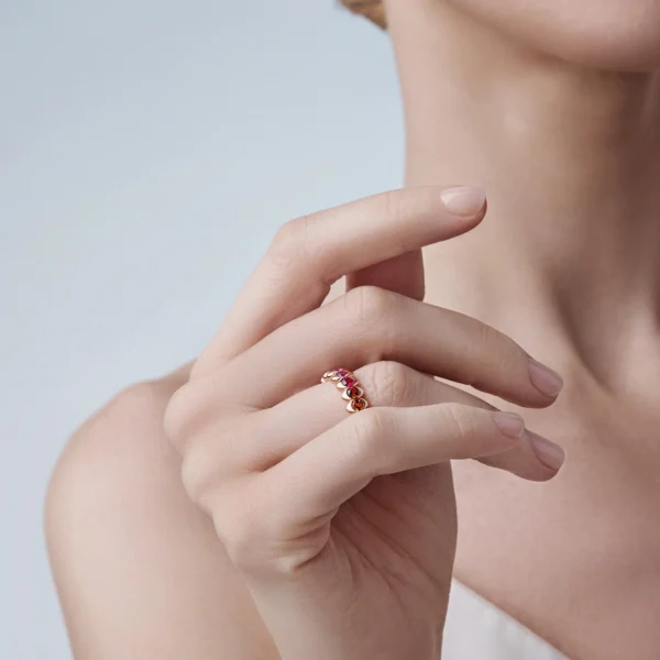 El anillo de eternidad de oro rosa y rubí Cosmic Curve Colours of Love presenta veinte rubíes mozambiqueños redondos engastados en oro rosa de 18 quilates. Los anillos de eternidad Cosmic Curve representan un vínculo eterno entre la familia, los amigos y la pareja. Se cree que el rubí, la piedra natal de julio, garantiza buena salud, sabiduría, riqueza y éxito en el amor. En consonancia con su afición por el deleite, la sorpresa y el descubrimiento, Fabergé ha ocultado un rubí en el interior de la banda. El anillo tiene 6 mm de ancho.