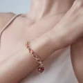 El charm de corazón de diamantes y Guilloché Enamel rojo Heritage Rose Gold está elaborado en oro rosa de 18 k, está decorado con esmalte guilloché rojo y tiene engastado un diamante blanco redondo de talla brillante. La pulsera con eslabones de cadena de oro rosa se vende por separado.
