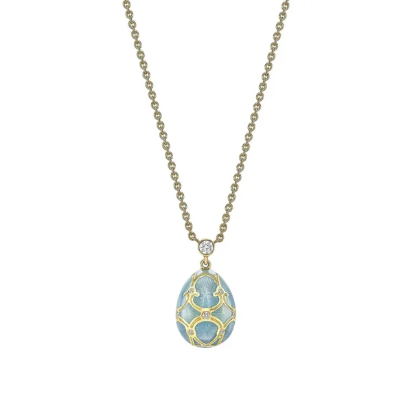 El colgante de huevo pequeño Heritage de oro amarillo con diamantes y Guilloché Enamel presenta esmalte guilloché en turquesa y diamantes blancos redondos, engarzados en oro amarillo de 18 quilates. El colgante mide 14 mm.