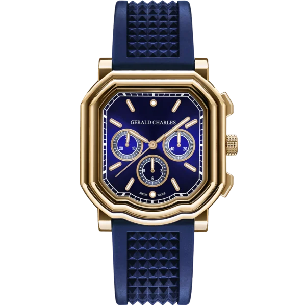 Gerald Charles crea, por primera vez, un nuevo modelo utilizando el más noble metal en su tonalidad más elegante, el oro rosa de 18 quilates, combinándolo con el azul royal irisado de su esfera y correa de caucho vulcanizado.