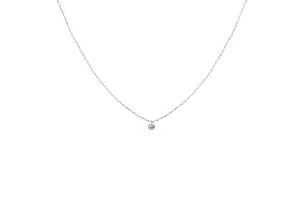 Está montado sin engaste (diamante perforado), sobre una cadena facetada de oro blanco 18kt.