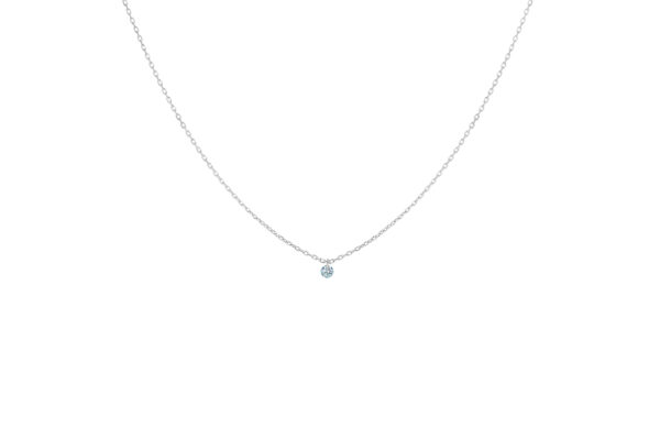 Está montado sin engaste (diamante perforado), sobre una cadena facetada de oro blanco 18kt.