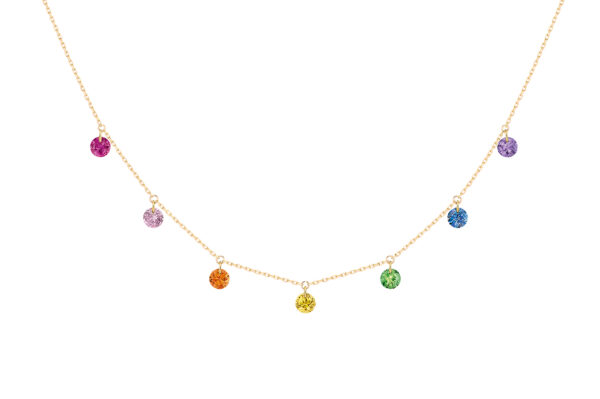 El collar RAINBOW de la colección CONFETTI presenta 7 piedras naturales por un peso total de 2,00 quilate : un rubí, un zafiro rosa, un zafiro naranja, un zafiro amarillo, un zafiro azul, una tsavorita y una amatista.
