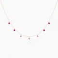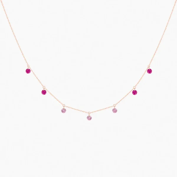 El collar ROSE de la colección CONFETTI presenta 7 piedras naturales: 4 rubíes y 3 zafiros rosas.