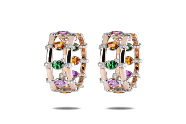 Tipo de Gema Diamante: G, VS: 1.31 ct | Zafiros naranjas y rosas: 5.92 ct | Tsavotitas: 4.88 ct