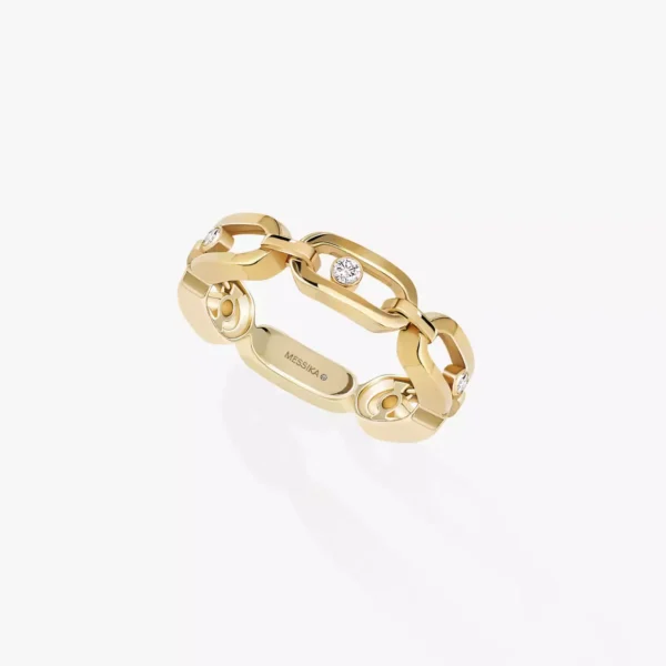 El anillo Move Link Multi, moderno y elegante, causa sensación al instante gracias a la repetición del motivo icónico Move Uno y la luminosidad solar de su oro amarillo. Además, este anillo de lujo representa el equilibrio justo entre modernidad y atemporalidad. Le hará brillar con una luminosidad sobria por sí solo. Combinado con su versión con pavé, le aportará un look moderno y gráfico que no pasará desapercibido. Diseñado como una alianza, este modelo ya ha seducido a numerosas mujeres en busca de una alianza original. Da igual la situación, este anillo femenino se adapta a todas.