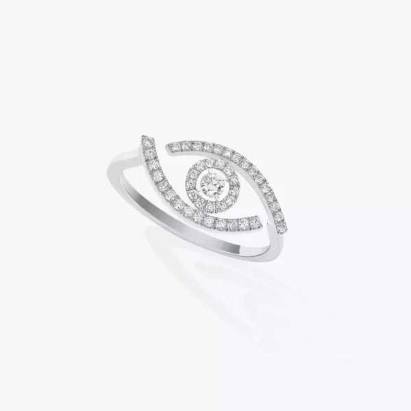 El ojo es un símbolo de benevolencia que ha trascendido los siglos. Presente en Oriente Medio, Turquía o Grecia, se ha convertido en una joya tipo talismán que protege del mal de ojo. La Maison de joyería y Alta Joyería Messika lo reinterpreta con un moderno toque de feminidad. El anillo con diamantes y pavé en oro blanco Lucky Eye deslumbra: los contornos del ojo con pavé combinan con el diamante central de 0,03 qt y su entorno de diamantes microengastados. Esta pieza se puede lucir ceñida a la piel.