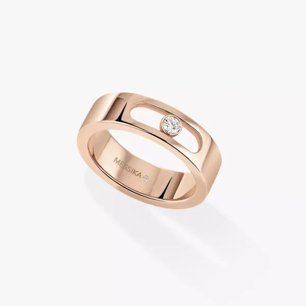 Fuerza, audacia y líneas minimalistas son el principal distintivo de este anillo de diamantes Move Joaillerie. Este anillo en oro rosa, que puede lucirse como alianza o para completar un look moderno, seducirá a hombres y mujeres con su diseño depurado y su diamante móvil, emblema de la colección Move.