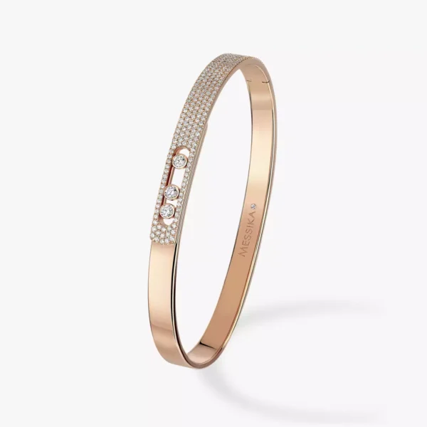 Es difícil encontrar una joya de diamantes más romántica que el bangle de diamantes con pavé en oro rosa Move Noa PM. Sus tres diamantes en movimiento, sello distintivo de la Maison de joyería parisina, simbolizan el amor eterno: tres tiempos para un sentimiento que toma fuerza con cada día que pasa. Erigida desde su creación a la categoría de pieza imprescindible, esta joya de lujo se reinventa cada año en un modelo más estilizado. Su versión con pavé resulta igualmente irresistible: se distingue por el juego de luces entre los destellos solares del oro y la miríada de deslumbrantes diamantes.