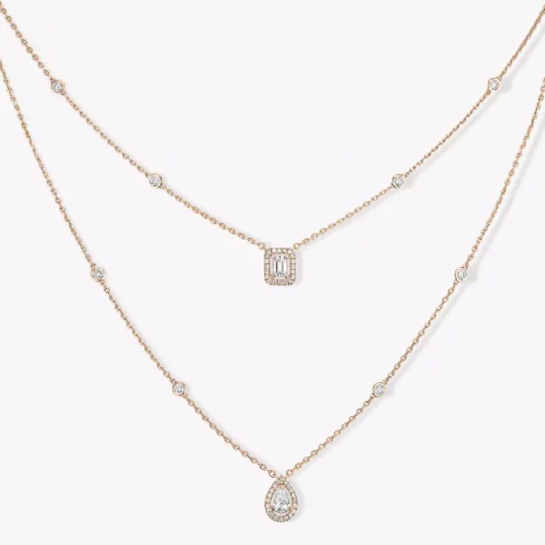 La colección My Twin rinde homenaje al diamante en todas sus formas y tallas, especialmente, al juego de luces que se crea entre la talla pera y la talla esmeralda. Valérie Messika se interesa en particular por la aparente oposición entre el espíritu arquitectónico de la talla esmeralda y el contorno de la talla pera. Este collar de 2 cadenas con diamantes en oro rosa de 18 quilates My Twin reinterpreta la tendencia actual de la acumulación de dos collares de diamantes. Una creación moderna sobre dos cadenas de longitudes distintas donde dialogan un diamante talla pera de 0,20 ct y un diamante talla esmeralda de 0,20 ct. Por encima de un pronunciado escote en V, una camisa abierta o un jersey de cuello alto, este collar de diamantes en oro rosa viste el cuello y sublima la belleza del escote con un toque refinado. El oro rosa de 18 quilates creado por Messika presenta un tono especialmente sutil y discreto. Este confiere al collar de dos cadenas con diamantes un carácter refinado nada ostentoso.