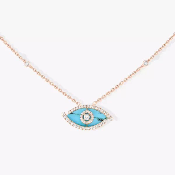 Déjese tentar por esta versión sumamente colorida del emblemático ojo estilizado de Messika. Este collar de lujo en oro rosa es una extraordinaria alianza entre el diamante y la turquesa, veteada e intensa. La pupila de su amuleto favorito se ve sublimada por un minucioso engaste de diamantes. Unos diamantes de 0,10 quilates adornan la cadena del collar para mujer ajustable, un detalle precioso que aporta un resultado radiante de luz. El collar en oro y diamantes Lucky Eye realzará todo tipo de escotes, ya sea al llevarlo solo o combinado con otras joyas.