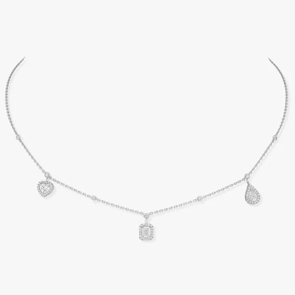 Cuente su historia con este collar de diamantes My Twin Trio en oro blanco. El número tres es uno de los símbolos más distintivos de la Maison de joyería y Alta Joyería Messika. Habla de la mujer que fue, la mujer que es y aquella en la que desea convertirse. Una historia trascendente y atemporal, como las tres tallas de diamantes que componen el collar My Twin Trio para mujer. Diamante talla corazón, diamante talla esmeralda y diamante talla pera: tres piedras eternas magnificadas por una aureola de diamantes talla brillante. Esta joya femenina de gran simbolismo presenta un estilo elegante y atemporal ideal para cualquier ocasión.