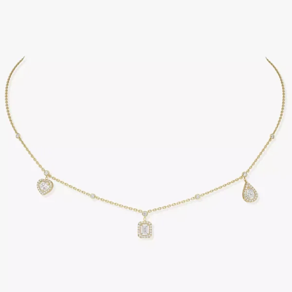 El collar de diamantes My Twin Trio en oro amarillo, con tres diamantes con borla, seduce hasta el infinito alternando entre diamantes talla corazón, esmeralda y pera. Esta joya de diamantes atemporal le acompañará cada día: podrá lucirla con un traje de vestir para un look elegante, o de un modo más informal con una camiseta y unos vaqueros. El collar se adapta a cualquier estilo. La magia de las joyas Messika: joyas de lujo que se adaptan a sus gustos y le acompañan día tras día.