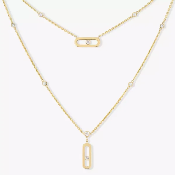 Para vestir el cuello y sublimar la belleza del escote con un toque refinado, Move Uno presenta una nueva versión del collar de dos cadenas con diamantes en oro amarillo. Una joya en oro amarillo de 18 quilates elaborada a mano con un motivo Move Uno vertical y otro horizontal, ideal para realzar discretamente la belleza del escote con su brillo solar. El diamante que se desliza por el interior del motivo en oro pulido lanzando sus destellos al ritmo de los gestos es el signo inconfundible de la colección Move. Este collar de lujo, que se inspira en la tendencia basada en combinar varias joyas, se lleva fácilmente con cualquier conjunto. Detalle elegante: los diamantes que adornan la cadena en oro amarillo añaden un toque de luminosidad a esta creación de Messika. Adopte este destacado collar de dos cadenas con diamantes y pavé en oro amarillo y descubra todas las piezas de diamantes de las colecciones de joyería y Alta Joyería de Messika.