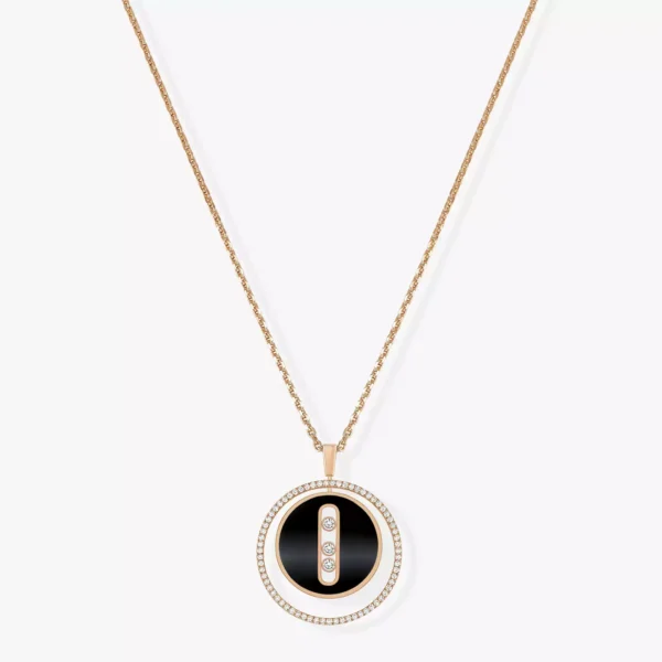 Sucumba al encanto del collar en oro rosa de 18 quilates y ónice Lucky Move MM, una creación llena de fuerza y audacia. Los diamantes móviles del centro del colgante se visten con un disco negro intenso de ónice que contrasta con el toque delicado del oro rosa, un reflejo de la fuerza interior de quien lo luce. El modelo destaca por su cierre ajustable, que permite lucirlo con distintas longitudes. Al igual que el lema Be Strong, este collar conectará con su energía interior. ¿Sucumbirá al poder de esta creación?