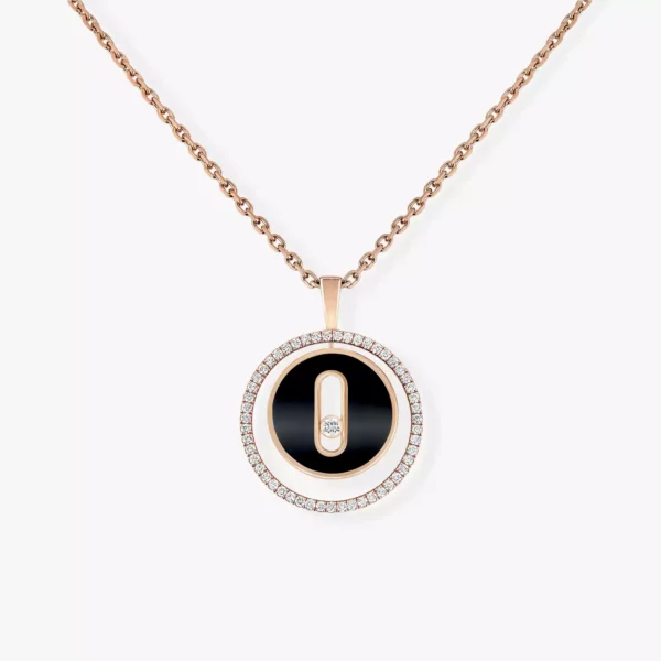 El collar Lucky Move de diamantes en oro rosa y ónice es el compañero ideal para la mujeres dueñas de su destino. Símbolo de fuerza y audacia, el ónix es una piedra elegante que destaca por la gran intensidad de su color negro. Puede lucirse con un conjunto sobrio o con uno más colorido, así como ceñido al cuello o más holgado a la altura del escote, gracias a su cierre deslizante que le permitirá llevarlo en cualquier ocasión. ¡Tome las riendas de su estilo y opte por este colgante Lucky Move!