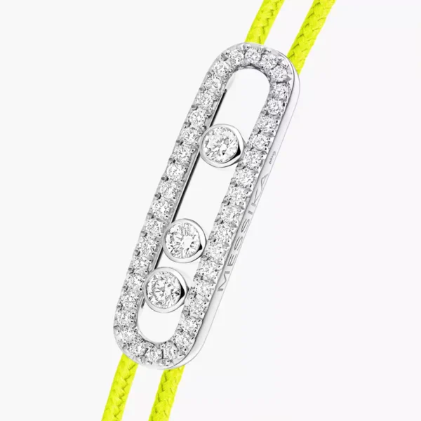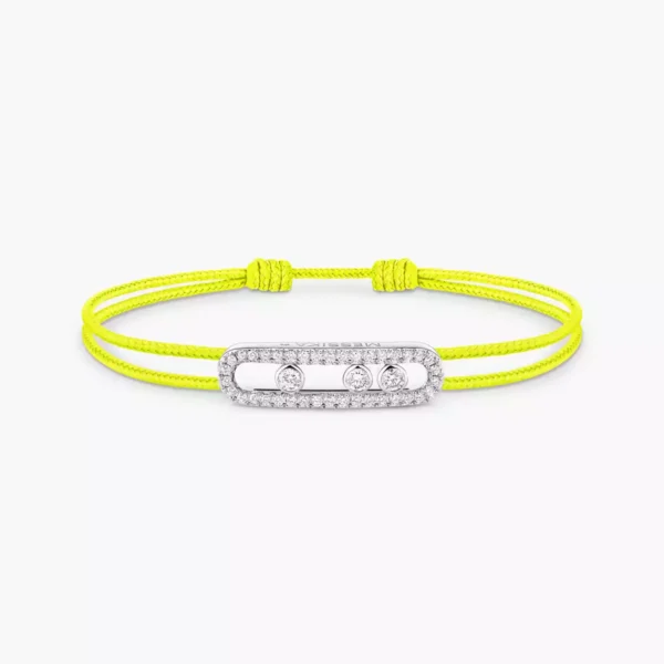 Original y comprometida, la pulsera de cordón amarillo fluorescente y oro blanco MESSIKA CARE(s) revisita el motivo Move en una versión magnética con pavé. Su luz brillante e intensa atrae las miradas al instante, y sus tres diamantes en movimiento añaden un toque de estilo a cualquier look. Toque de luz altamente simbólico, MESSIKA CARE(s) es una colección de joyas solidaria. Por cada joya de oro y diamantes vendida, la Maison dona una parte de los beneficios a través de la Fundación Valérie Messika a asociaciones y ONG internacionales que trabajan en favor de la infancia en los ámbitos de la educación y la salud.