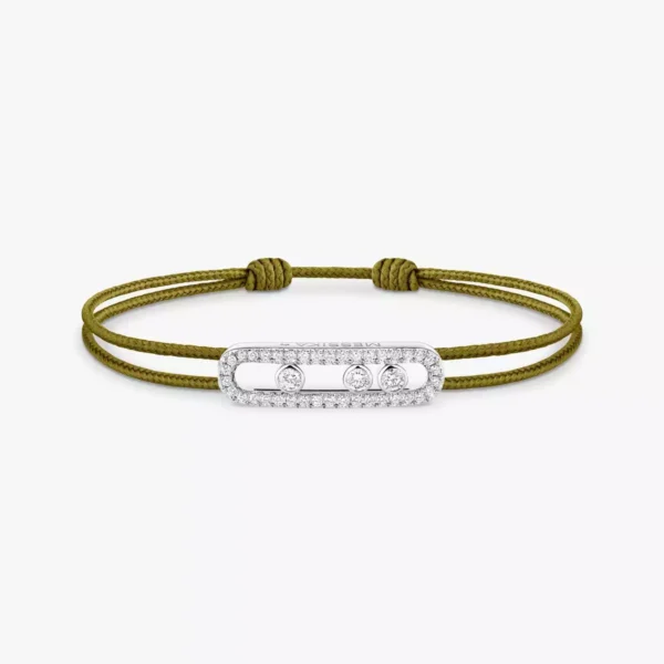 La pulsera de cordón de diamantes MESSIKA CARE(s), informal y elegante, reinterpreta el motivo Baby Move. Con sus tres piedras móviles y su motivo con pavé de diamantes en oro blanco, esta joya de lujo aporta el toque de luz perfecto para llevar a diario. Su cordón caqui se adapta a cualquier muñeca gracias a sus nudos deslizantes. MESSIKA CARE(s) es una colección filantrópica: parte de los beneficios se donan a través de la Fundación Valérie Messika a asociaciones y ONG que trabajan en favor de la infancia en los ámbitos de la educación y la salud. Un bonito símbolo para hacer o hacerse un regalo excepcional.