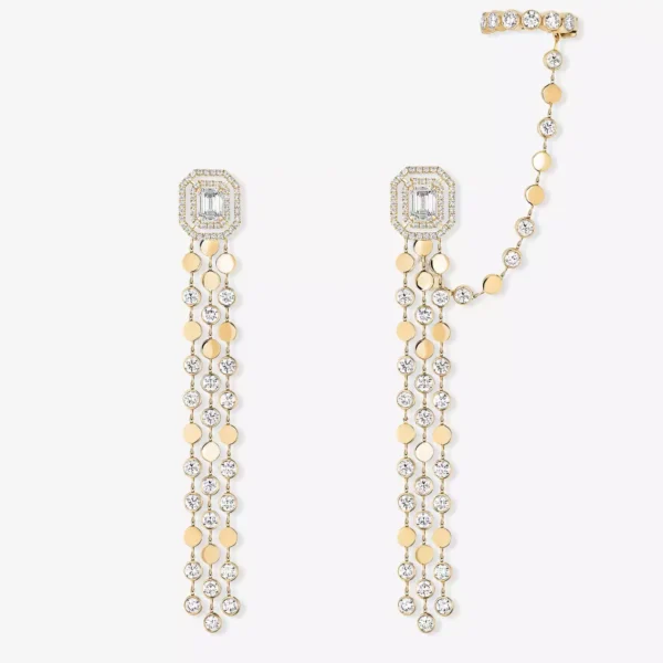 Descubra los pendientes D-Vibes multicadenas en oro amarillo y diamantes. ¡Hechos a mano, jugando con la flexibilidad del esmalte, siguen cada movimiento del cuello, atrapando la luz con su pavé de diamantes así como con los 2 diamantes talla esmeralda de 0,30 quilates que visten cada pendiente! Atrevidos pendientes de diamantes para mujer que añadirán un toque de brillo a cualquier look.