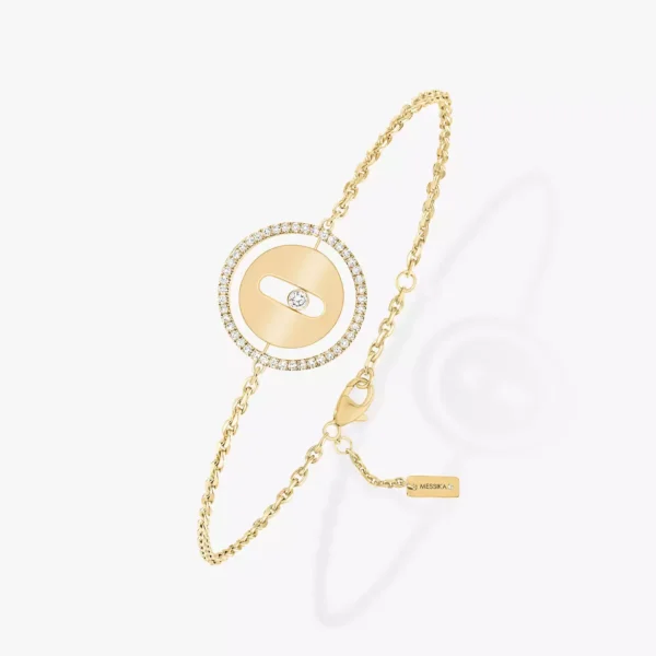 La nueva colección distintiva Lucky Move reinventa el ya emblemático diamante móvil. Esta pulsera de cadena con diamantes en oro amarillo, elaborada a mano en el secreto de los talleres de joyería, envuelve la muñeca con elegancia gracias a su delicada cadena y su aureola de diamantes. Esta pieza se presta al juego de la acumulación de joyas, esta última tendencia para lucir sus joyas de lujo mezcladas entre sí.