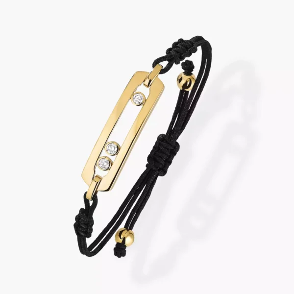 Déjese seducir por la pulsera de cordón con diamantes en oro amarillo de Messika. Esta pulsera de cordón en oro amarillo de 18 quilates totalmente elaborada a mano con tres diamantes talla brillante en movimiento de 0,08 ct cada uno pertenece a la emblemática colección de joyería Move. Descubra su diseño depurado y vanguardista adornado con el sencillo cordón negro en una versión actualizada creada tanto para ella como para él. Una alternativa más masculina al tradicional brazalete para hombre. Esta pulsera de cordón con diamantes en oro amarillo se ajusta con facilidad gracias a las dos perlas de oro deslizantes. Puede lucirse a diario sola o bien combinarse con el reloj. El oro amarillo, símbolo de preciosismo, combina a la perfección con el diamante, al que confiere una cierta delicadeza.