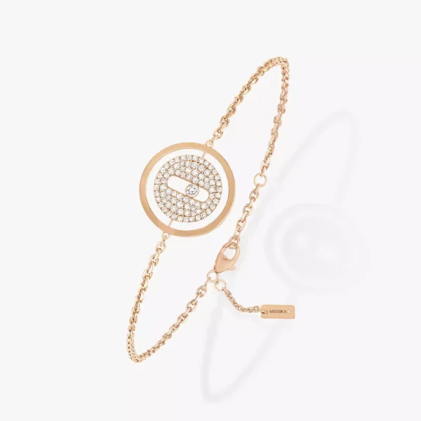 La nueva colección distintiva Lucky Move reinventa el ya emblemático diamante móvil. Esta pulsera de cadena con diamantes en oro rosa, elaborada a mano en el secreto de los talleres de joyería, envuelve la muñeca con elegancia gracias a su delicada cadena y su aureola de diamantes. ¿Por qué elegir una pulsera de cadena con diamantes y pavé en oro rosa? El carácter ultrafemenino del oro rosa combinará fácilmente con sus joyas en oro amarillo, oro blanco o plata. Esta pieza se presta al juego de la acumulación de joyas, esta manera de última tendencia de lucir sus joyas de lujo mezcladas entre sí.
