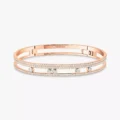 Pieza emblemática, la pulsera rígida Move Romane se presenta ahora en una versión con un pavé deslumbrante. Esta pulsera de lujo presenta una forma equilibrada de forma exquisita en la que tres diamantes móviles se deslizan libremente entre dos bandas de oro. Este juego de preciosas y modernas asimetrías da aún más protagonismo a los diamantes, sublimados aquí por la suavidad del oro rosa. Su diseño minimalista y arquitectónico aportará un toque de elegancia a su silueta. Nos encanta el intenso juego de luces que se crea al combinarla con el lujoso anillo Move Romane con pavé, juego que hará brillar cada uno de sus movimientos.