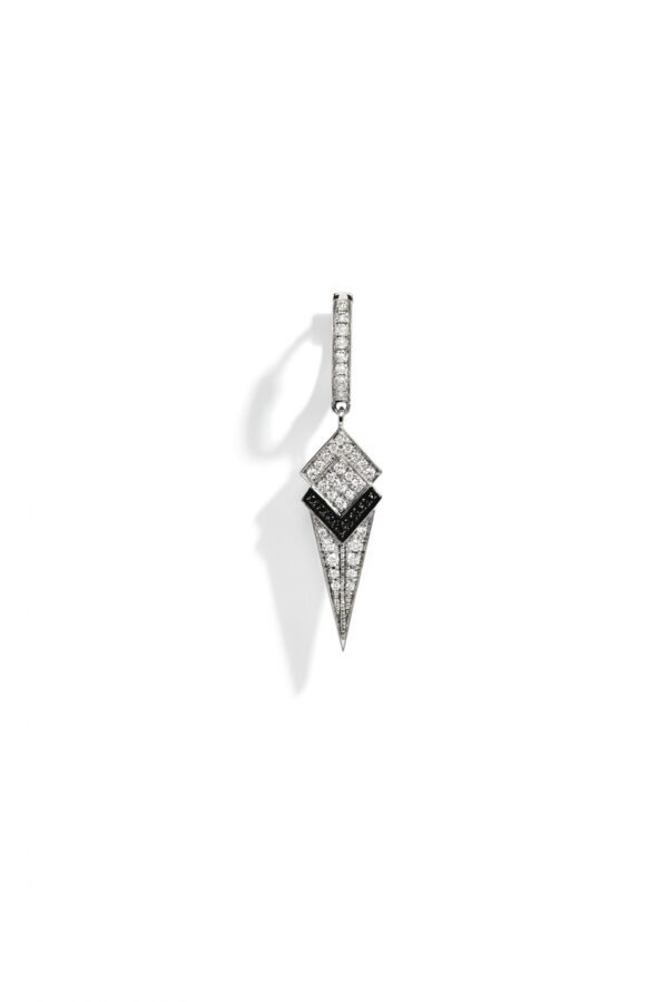 Aro Stairway Cono degradado de plata de primera ley con baño de rodio, engastado con 38 diamantes talla brillante calidad G-VS, con un total de 0,14 quilates y engastado con 7 diamantes negros talla brillante calidad G-VS, con un total de 0,03 quilates.Tamaño: 3 ,2cm x 0,8cm.