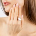 Detalles: Anillo Victoria de oro amarillo 750 con diamantes, nácar grande (3,10 quilates) y diamantes (0,220 quilates).