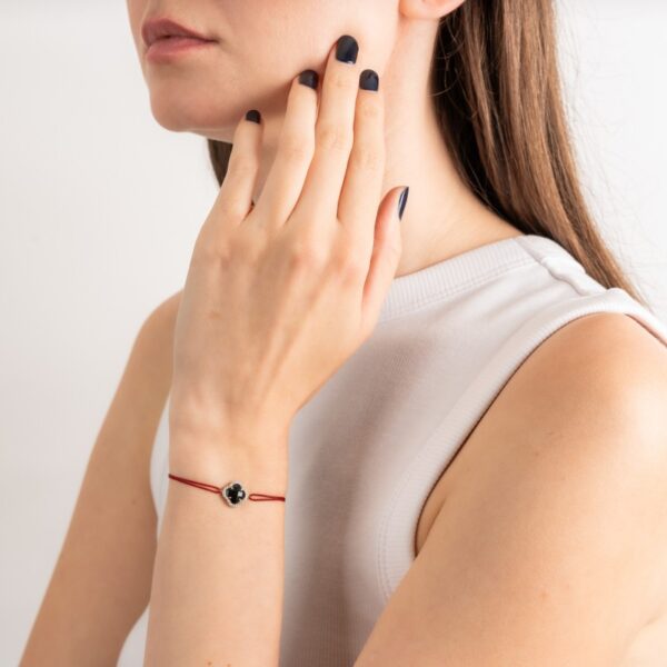 Detalles: Pulsera Victoria de oro rosa 750 con diamantes, ónix pequeño (1,07 quilates) y diamantes (0,096 quilates), cordón rojo.