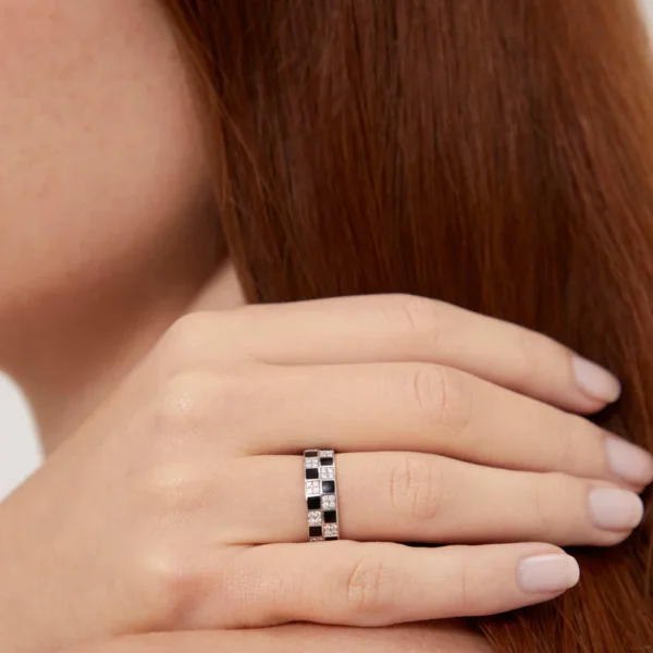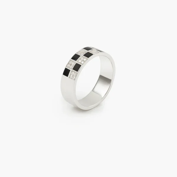 El oro blanco de 18 quilates y los brillantes diamantes cultivados en laboratorio se combinan con la laca, creando un hipnótico patrón de tablero de ajedrez que evoca la danza entre el día y la noche. Los diamantes cultivados en laboratorio, como estrellas brillantes, iluminan esta joya talismánica.