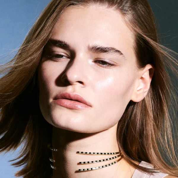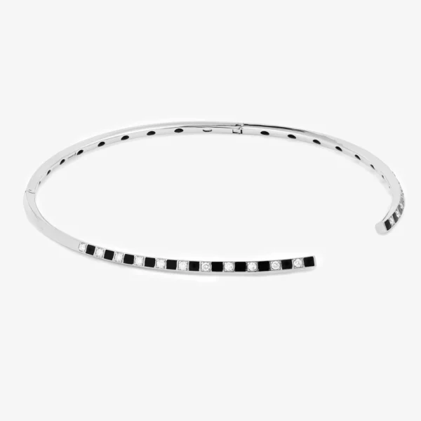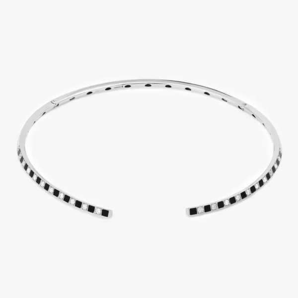 La laca negra, aplicada con delicadeza y precisión, realza el diseño de tablero de ajedrez del collar CHOKER ILLUSION. Evoca profundidad y misterio, en armonía con la energía de Capricornio.